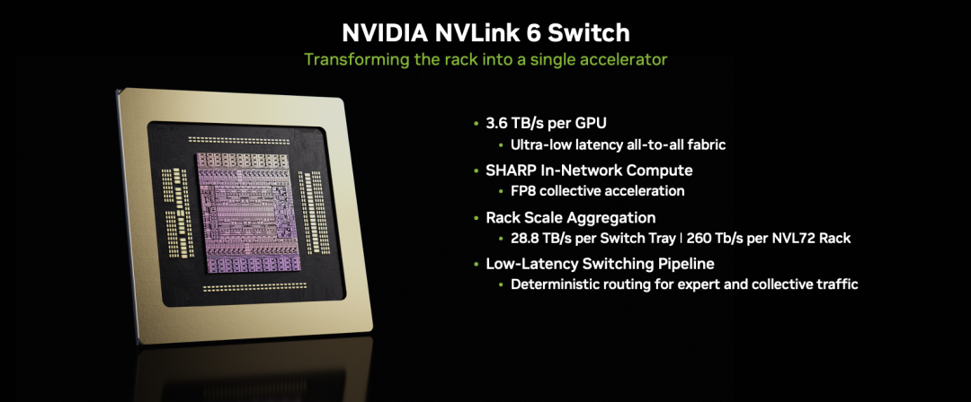 - NVLink 6 Switch:实现机架内 GPU 互联,每 GPU 带宽达 3.6TB/s