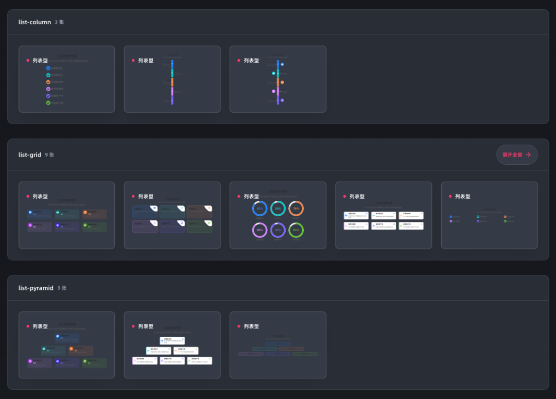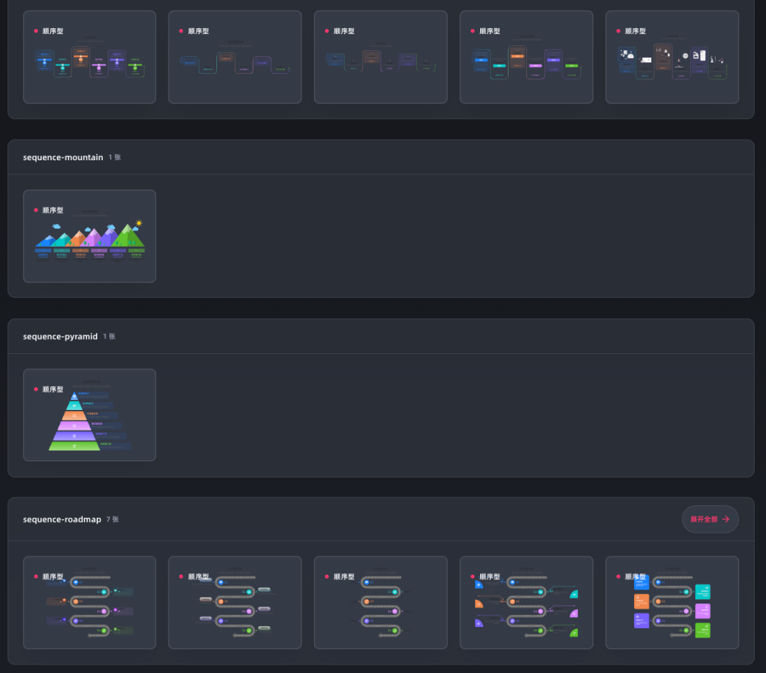 与 ECharts 等通用图表库不同,它的设计目标是让用户用更直观的方式描述信息的层级关系、流程顺序、对比维度等逻辑结构,然后由引擎自动完成布局和渲染。