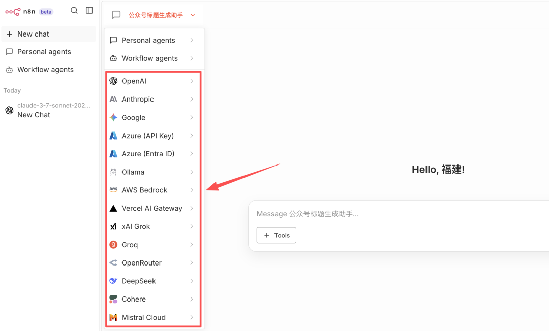 定位:在 n8n 内直接进行基础聊天,支持通过 OpenAI 兼容 API 选择模型。