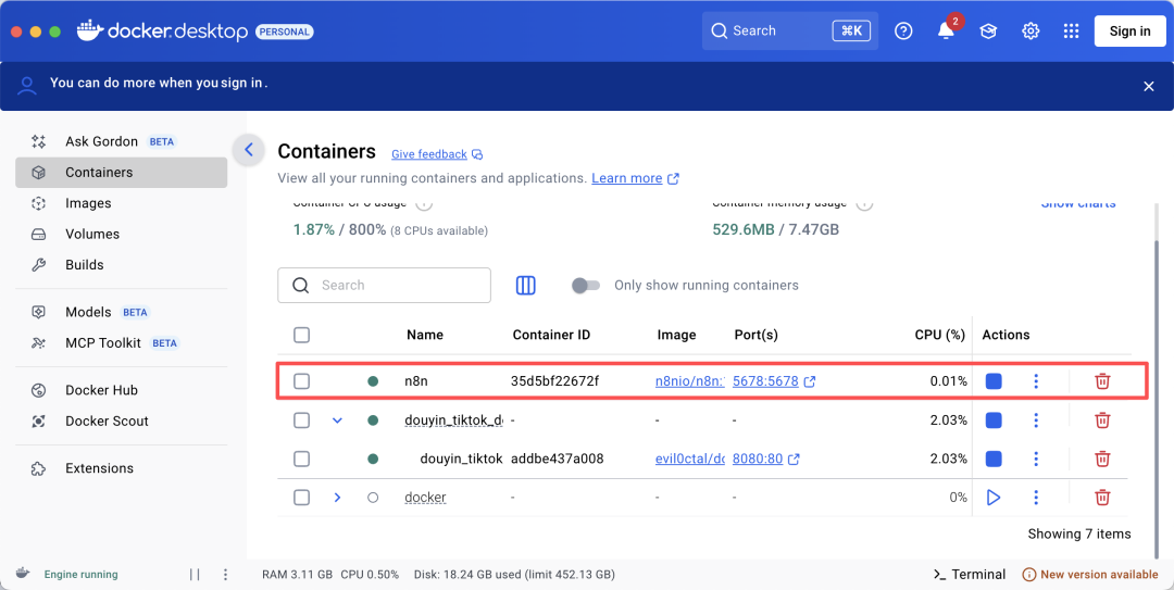 在 Docker 管理界面或命令行查看是否有名为 n8n 的运行中容器。