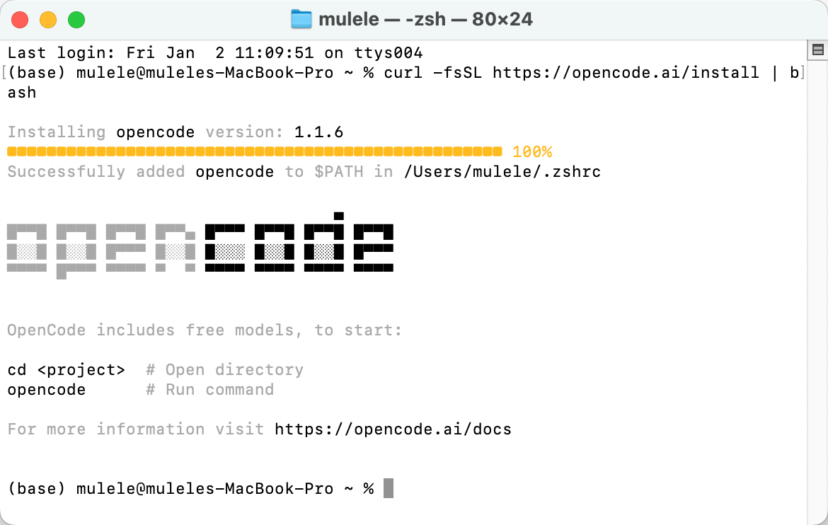 打开 Terminal,运行安装脚本。OpenCode 提供了两种安装方式,我推荐使用命令行方案,与 VSCode 的协作体验最流畅。