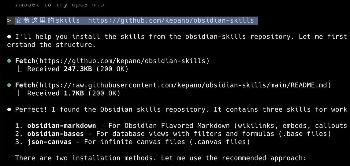 - 在Claude Code中加载项目:输入指向 https://github.com/kepano/obsidian-skills 的安装命令