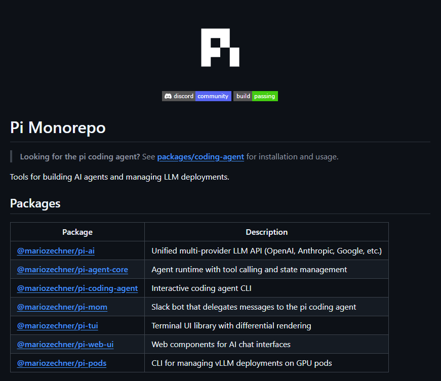 未经允许不得转载:pi-mono:AI 智能体工具包,从 LLM 集成到智能体部署的完整工具链,包含编码代理 CLI、统一 LLM API 和 UI 库