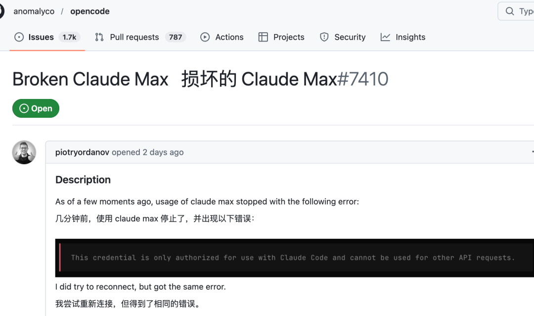 1 月 9 日:OpenCode 的 GitHub 仓库出现编号为 #7410 的 Issue。用户 @piotryordanov 反馈在使用「Claude Max」模式时服务中断,评论区陆续跟进,很多人无法连接。