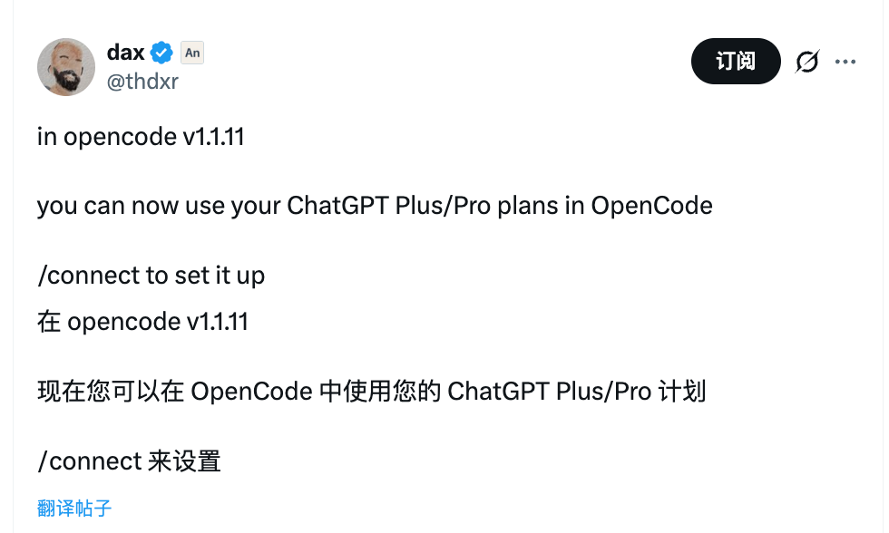 1 月 10 日:OpenCode 核心开发者 Dax (@thdxr) 宣布发布 v1.1.11 版本,支持在 OpenCode 里直接使用你的 ChatGPT Plus/Pro 订阅。他的表述是:“We are working with OpenAI to allow Codex users to benefit from their subscription directly within OpenCode.”