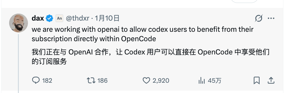 另一边,OpenCode 的创始人迅速宣布与 OpenAI 达成深度合作,直接打通了 ChatGPT Plus/Pro 的订阅权限。
