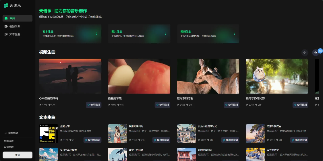 - 图片/视频生音乐:用户上传图片或不超过60秒的视频,天谱乐能智能匹配并生成高度契合的BGM,同时呈现30秒的MV效果。
