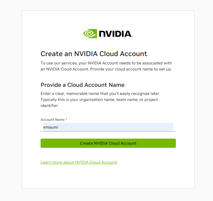 接着随便起个账户名,创建 NVIDIA Cloud Account。