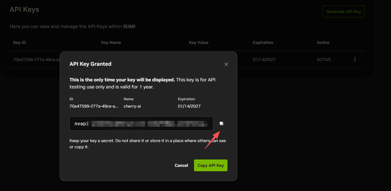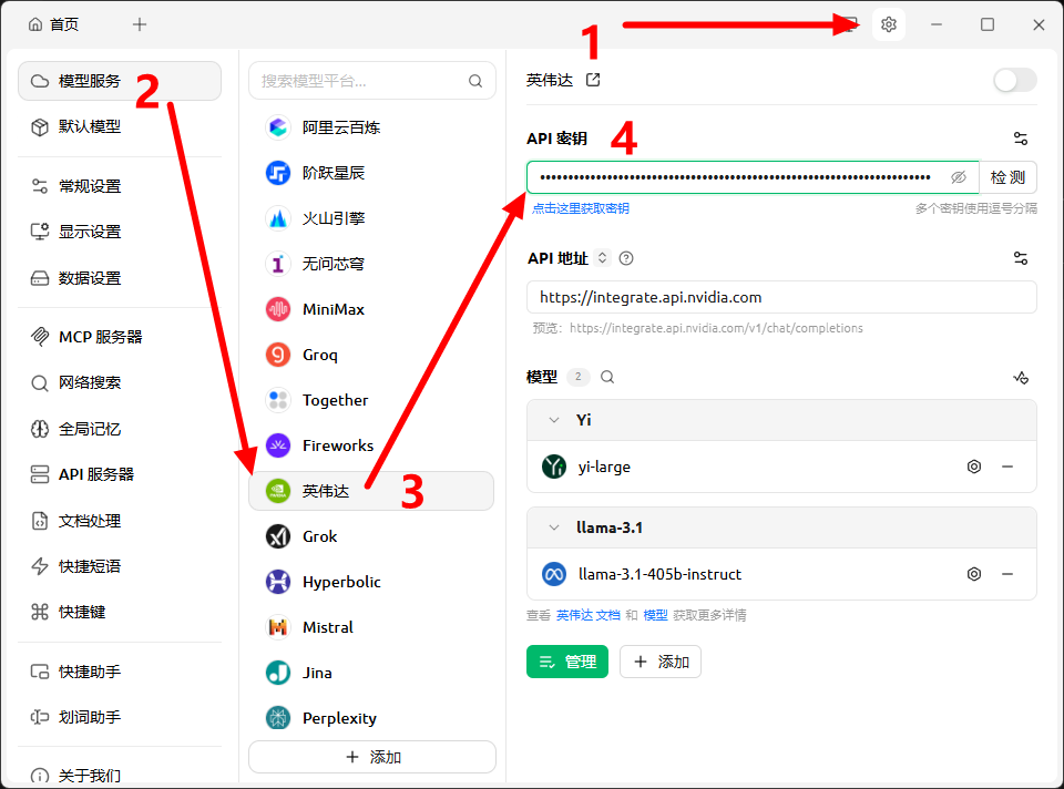 找到模型服务 - 英伟达,填入Keys