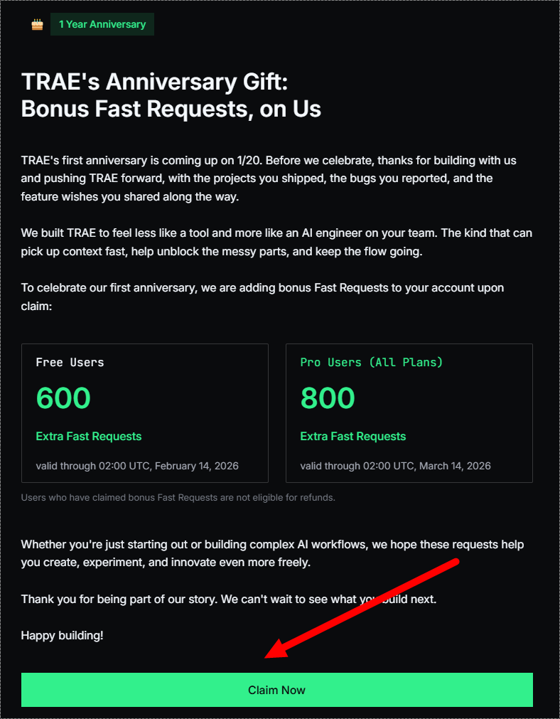 今天(1 月 14 日)上午 10 点开始,所有 TRAE 国际版用户,不管你是 Free 还是 Pro,统统送 Fast Request 额度!