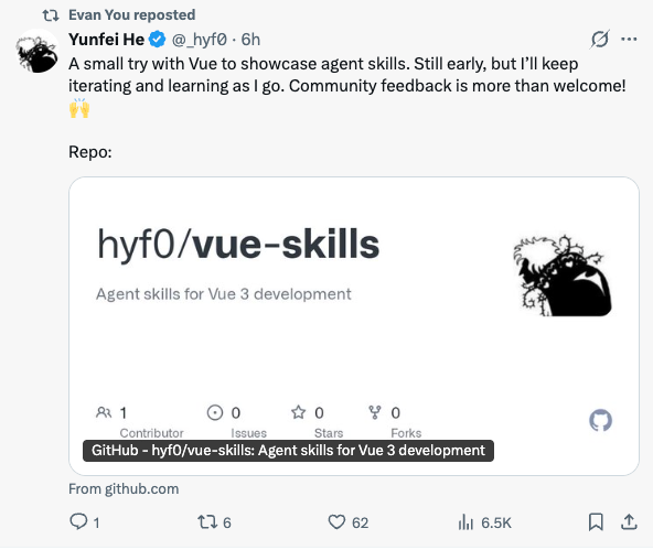 这个想法在昨天被彻底验证了。尤雨溪转发了一个项目:vue-skills,作者是 Vue 团队成员 Yunfei He。