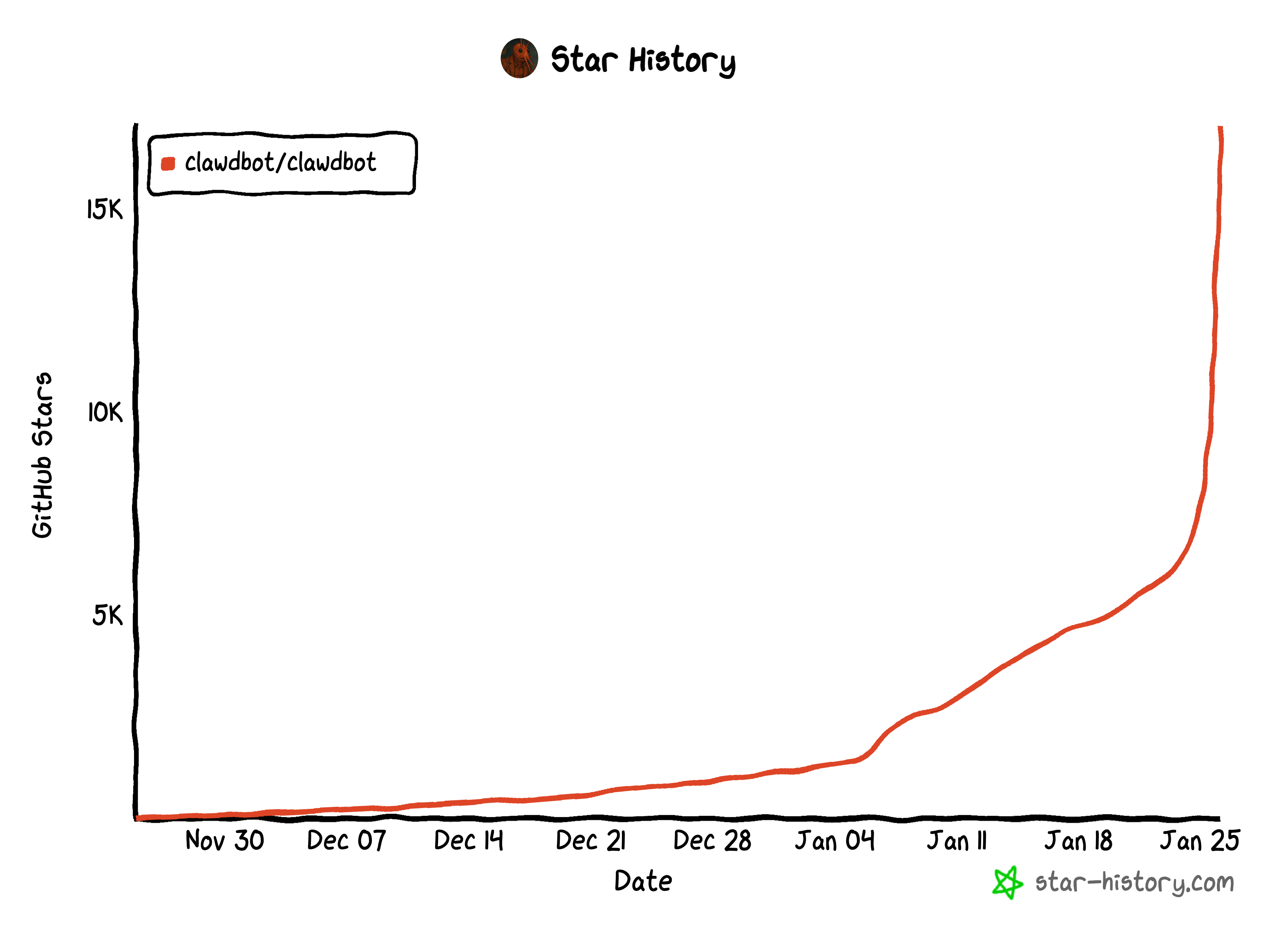 Clawdbot在短短24小时内获得9000+的Star增长,从7.9K直接蹿到17K+。