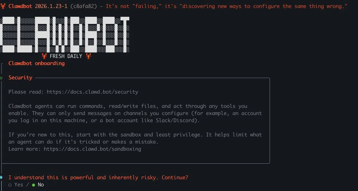 风险声明确认:Clawdbot拥有较高的系统权限,需明确理解使用风险