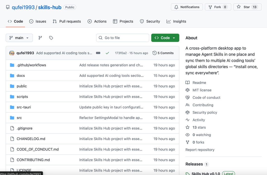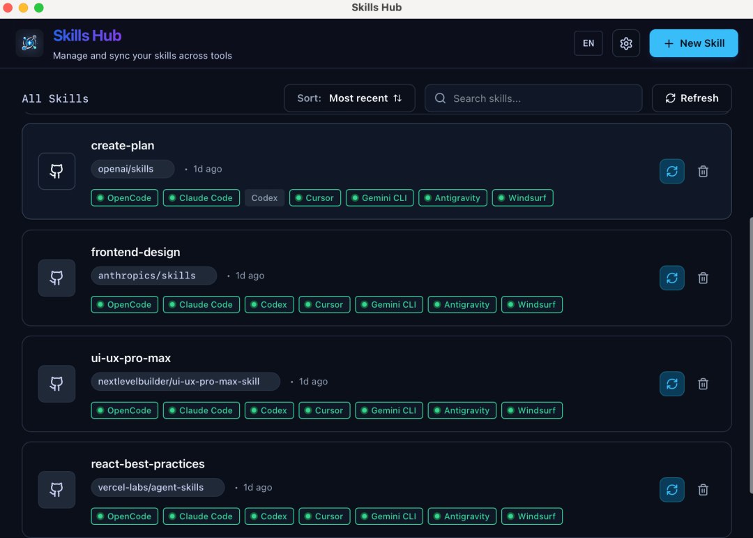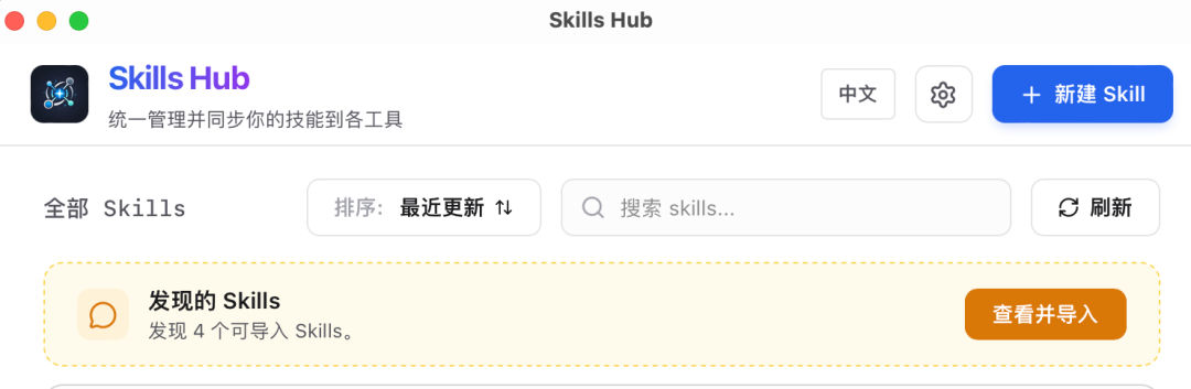 Skills Hub是一个基于Tauri + React开发的跨平台桌面应用,专门用来统一管理部署在不同AI编程工具上的Skills。