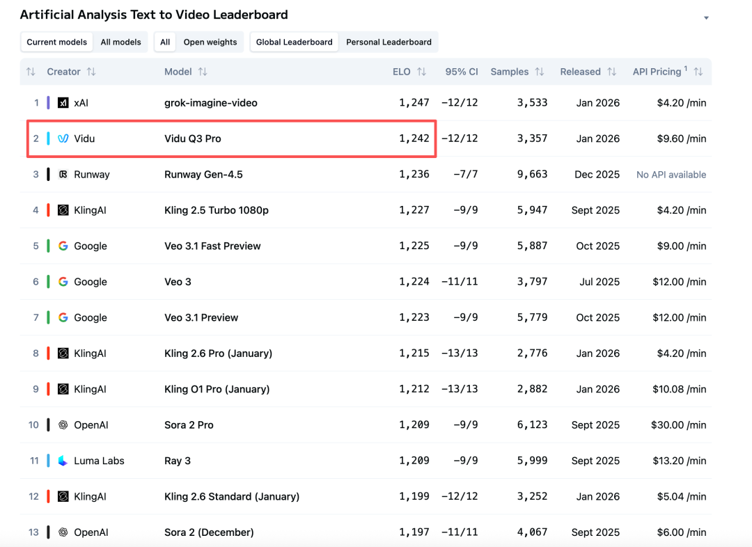 根据 Artificial Analysis 的 Video Arena(盲测偏好投票,ELO 排名),Vidu 最新一代商业级视频模型 Vidu Q3 在 Text-to-Video 总榜里 ELO 评分为 1242,全球第二、中国第一,超过了 Runway Gen‑4.5、Google Veo 3.1 和 OpenAI Sora 2,仅次于 xAI 的 Grok Imagine(视频)。