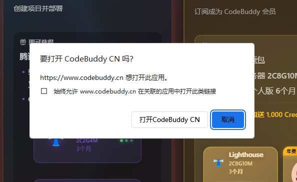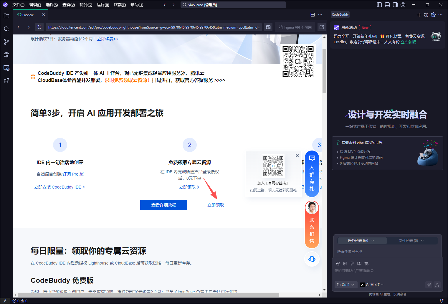 有下载安装后,接着回来点击页面上的“领取”按钮,会自动打开CodeBuddy,点击软件上的提示「立即领取」