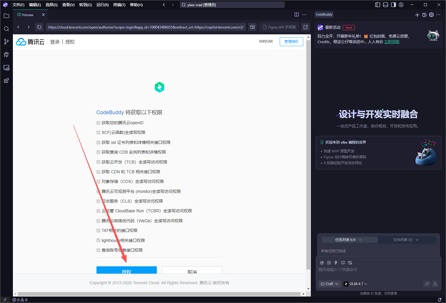 根据提示完成授权,接下来的步骤都会在CodeBuddy上操作。