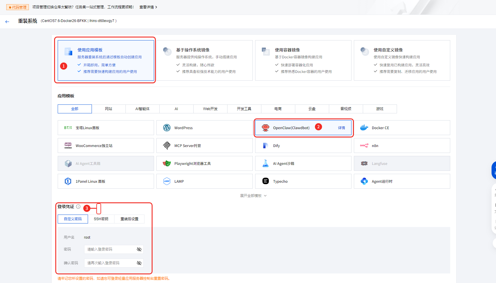 选择「使用应用模板」- 选「OpenClaw(Clawdbot)」,登录凭证可设也可不设(如果用SSH连接使用最好设置一下)