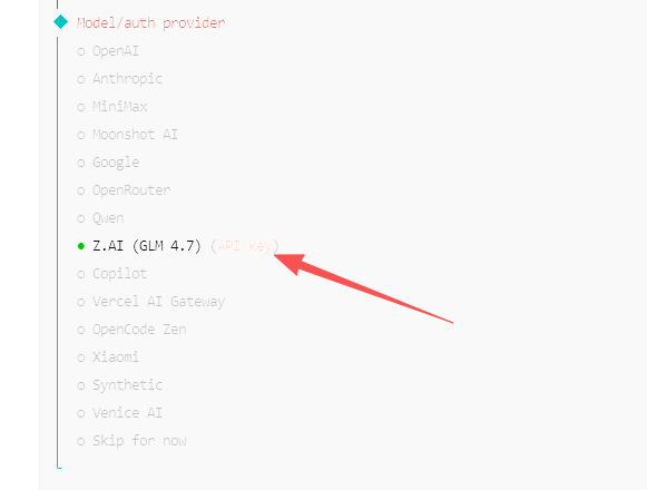 回到配置环节,我选择Z.AI(GLM 4.7)