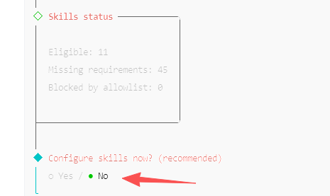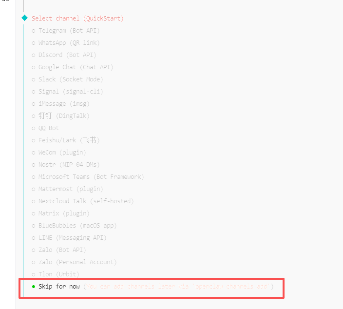 因为OpenClaw支持的聊天软件太多了,今天先跳过,所以直接选最后一个skip:
