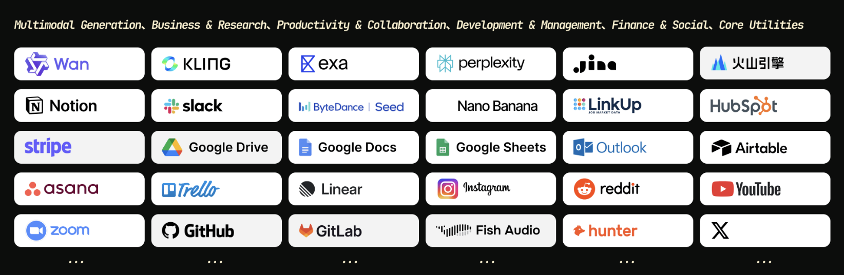 输入侧支持3000+原生工具集成(Stripe、Slack、Salesforce、GitHub等)及完整MCP协议支持,同时支持私有系统连接器(数据库、内部API、私有脚本)。