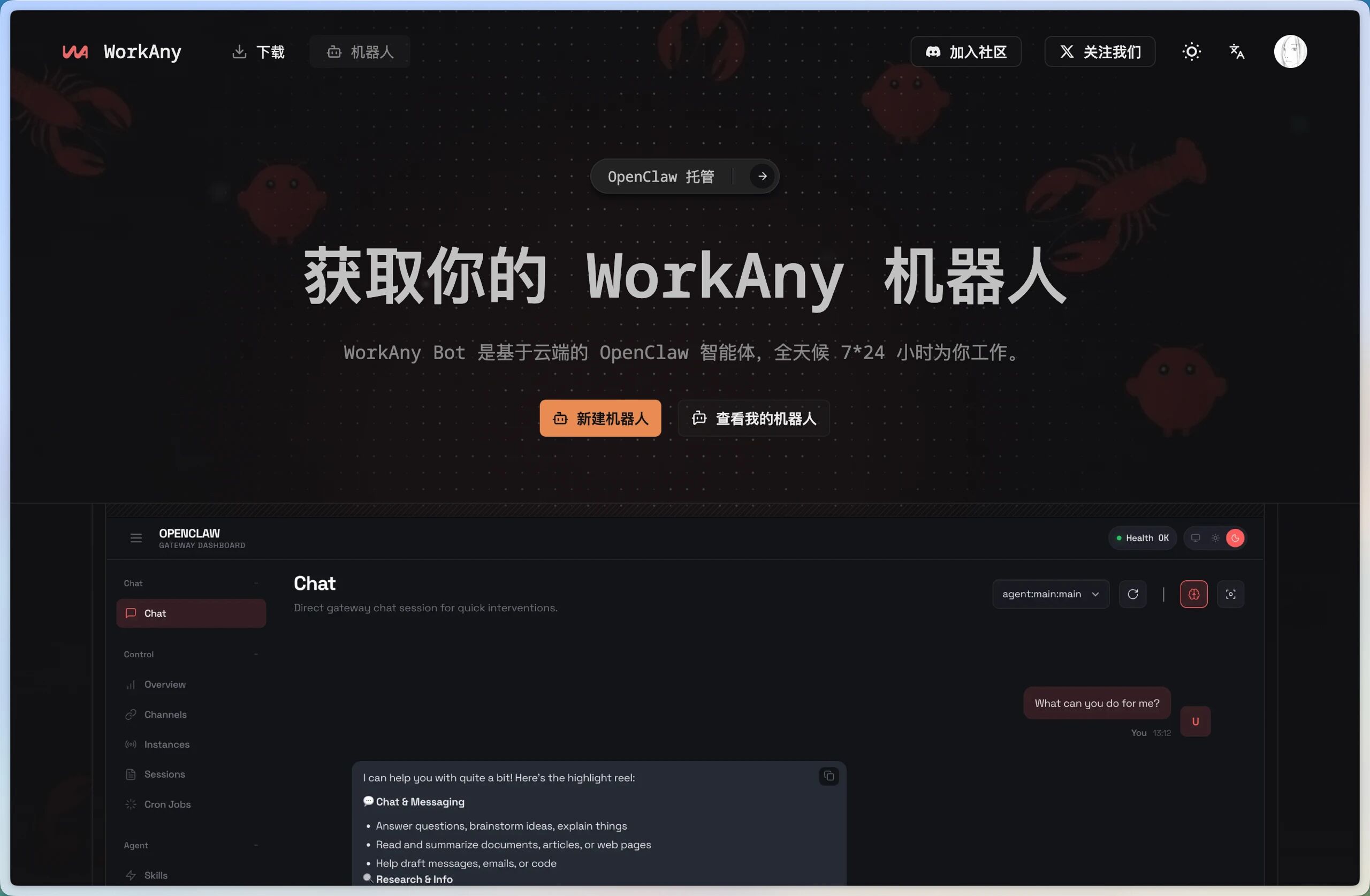 WorkAny Bot 的本质是一个托管在云端的 OpenClaw 智能体实例。