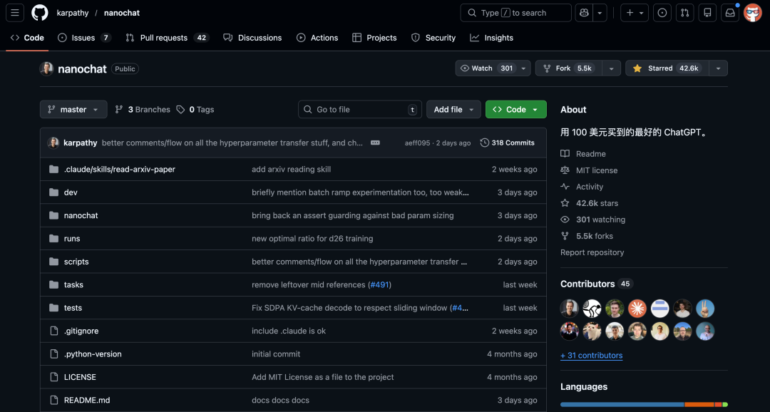 如果说 nanoGPT 聚焦预训练阶段,nanoChat 则是端到端的大模型训练框架,包含了将基础模型转化为ChatGPT风格的对话模型所需的全部步骤。