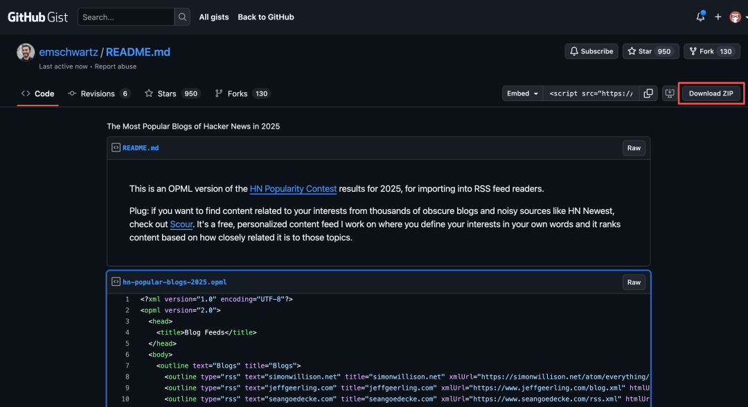 他开源了一份OPML格式的订阅源文件,收集了2025年Hacker News上最受欢迎的92个博客。