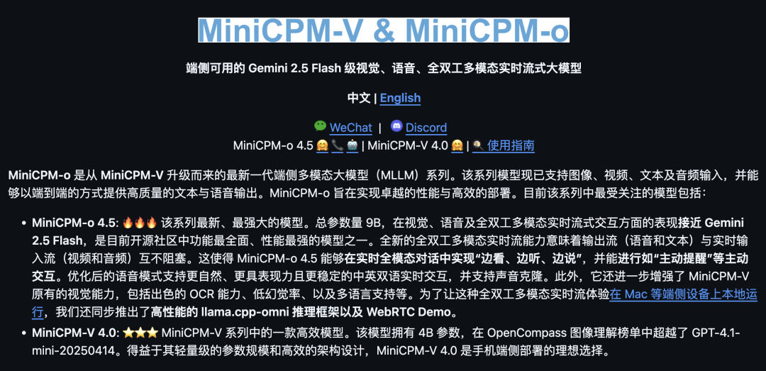 - MiniCPM-V系列:MiniCPM-o 4.5的视觉模块基于同系列的设计,在图像理解上也有出色表现