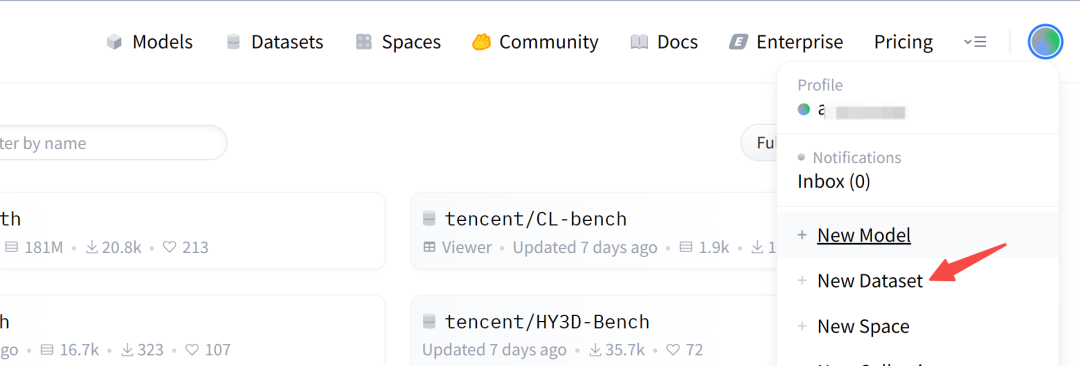 在个人头像菜单中选择"+ New Dataset"