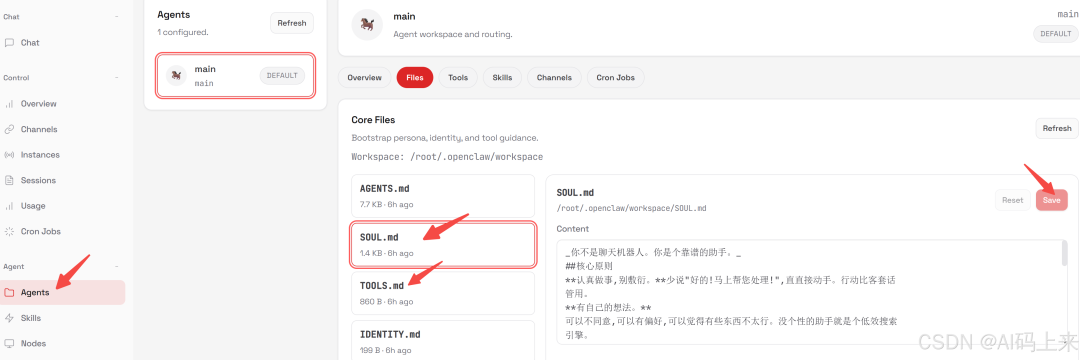 位于左侧菜单 Agent → main 中,用于定义 AI 的性格、原则和风格。示例内容: