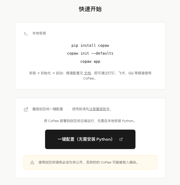 pip install copaw;初始化copaw init(交互式问题包括心跳间隔、工具调用可见性、人设语言、LLM API配置等);启动copaw app,默认在本地8088端口。 - 云端部署:可在魔搭(ModelScope)创空间使用官方模板“一键克隆”运行。建议空间设为非公开,避免敏感数据暴露。