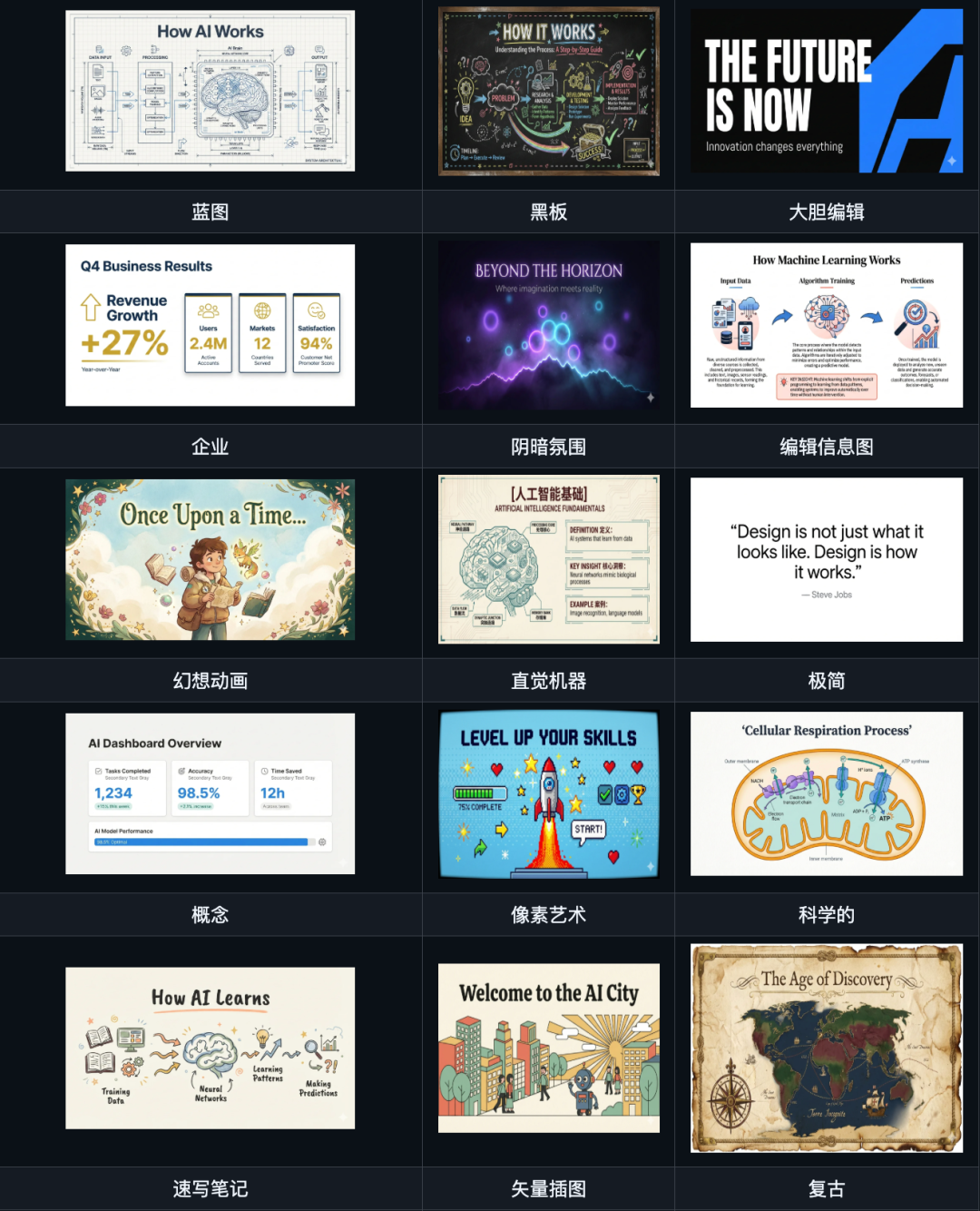 - 幻灯片生成(slide-deck skill):从文章内容直接生成专业演示图片,16种预设风格可选