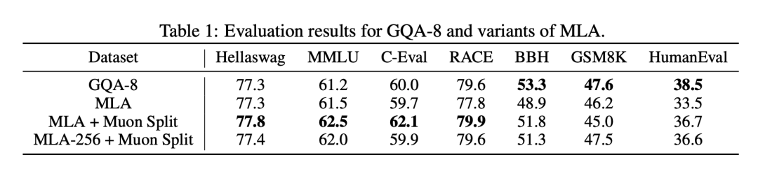 训练中团队发现:Muon 优化器与 MLA 的组合效果不如更简单的 GQA-8。于是提出 Muon Split:将原本对整块投影矩阵做的正交化,改为“按注意力头逐个进行”,让不同头各自独立更新。