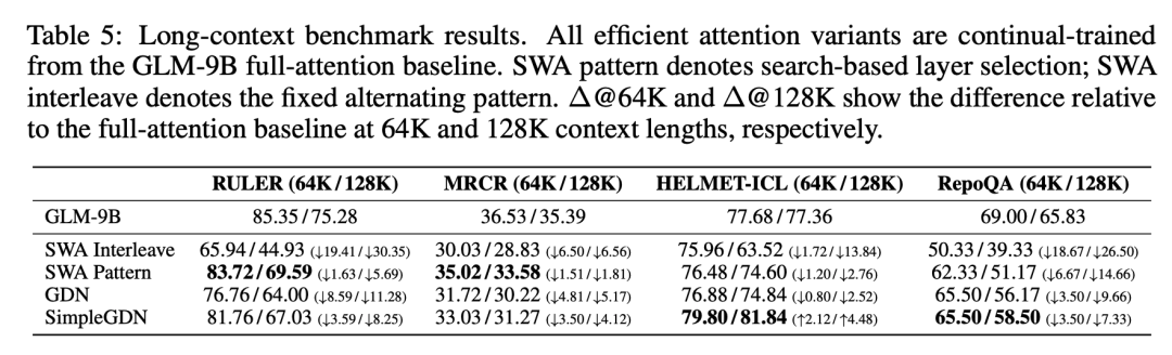 - 朴素滑动窗口交错:固定每隔一层用窗口注意力,在 128K 上下文 RULER 跌 30 分,基本不可用。