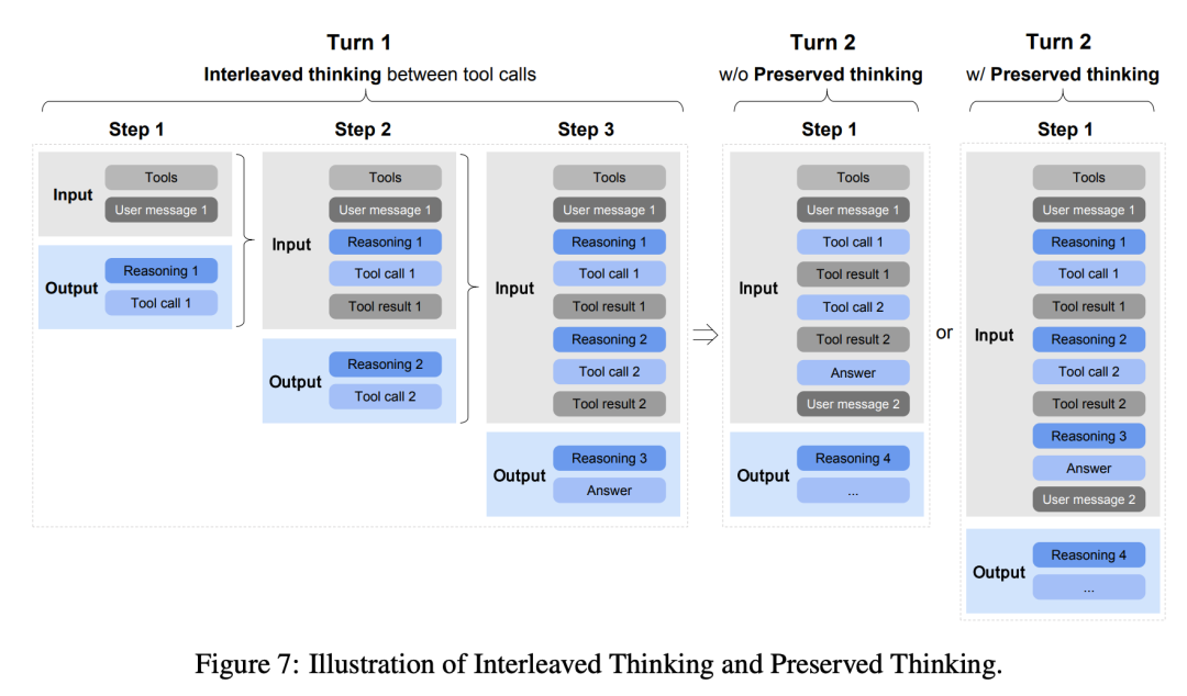 - 交错思考(Interleaved):每次响应和工具调用前都先思考一轮,提升遵循与生成质量。
