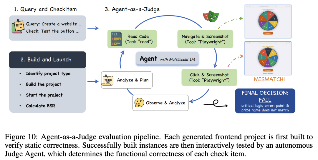 使用 Claude Code + Claude Sonnet 4.5 配合 Playwright 做 Agent-as-a-Judge,让一个 Agent 操作另一个 Agent 生成的前端项目,执行点击、输入、截屏等,逐项验真。