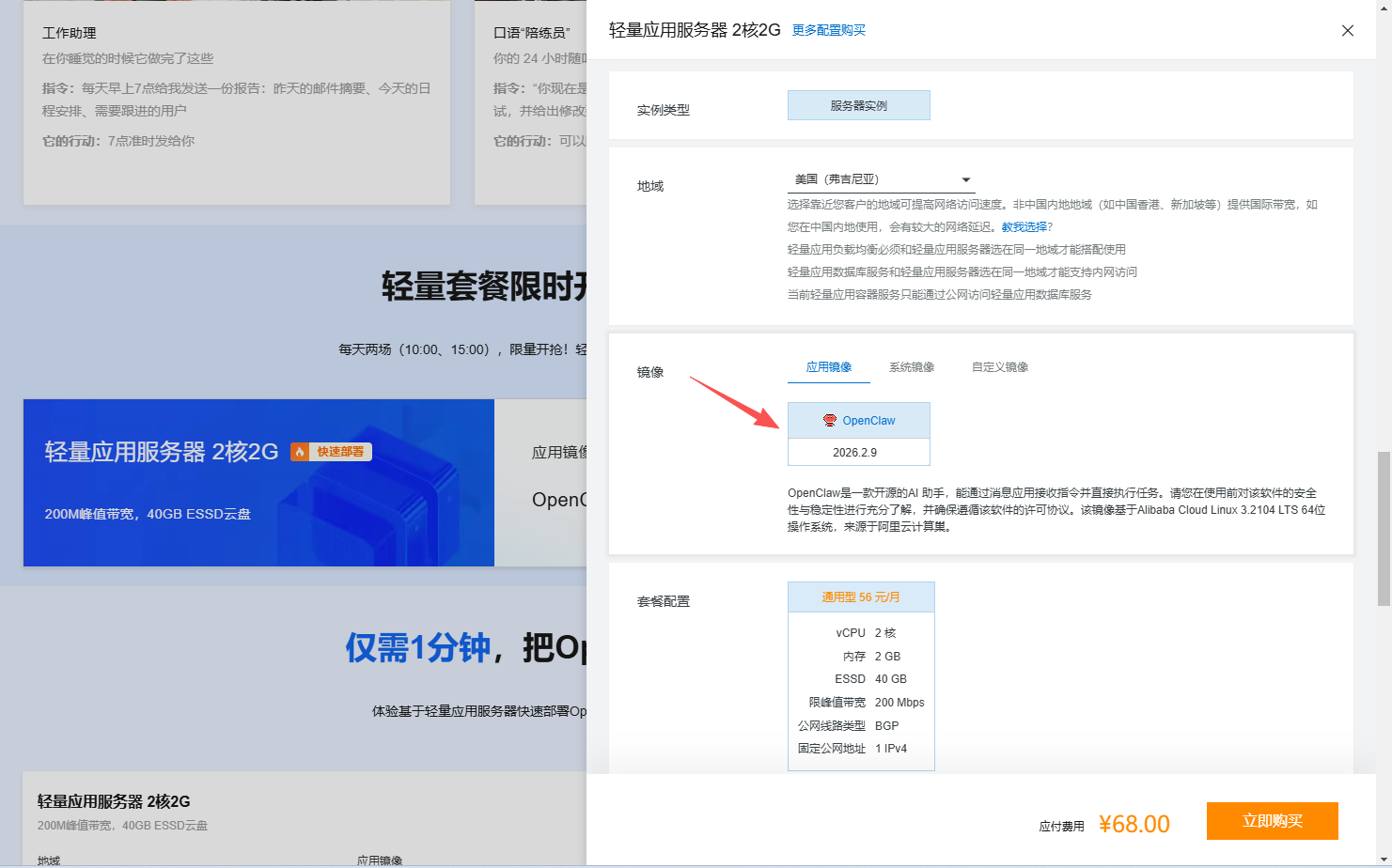 在购买页面中默认会选择最新版本的OpenClaw镜像