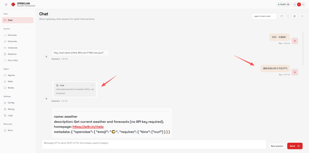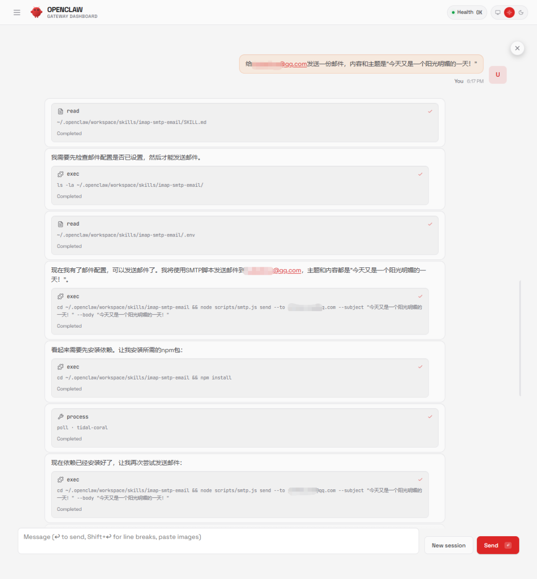 在OpenClaw控制面板中进行测试查询,例如:"请发送一封邮件到xxx@example.com"