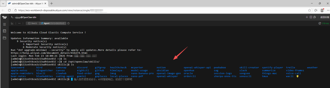 进入 /opt/openclaw/skills 目录查看已安装的技能模块列表
