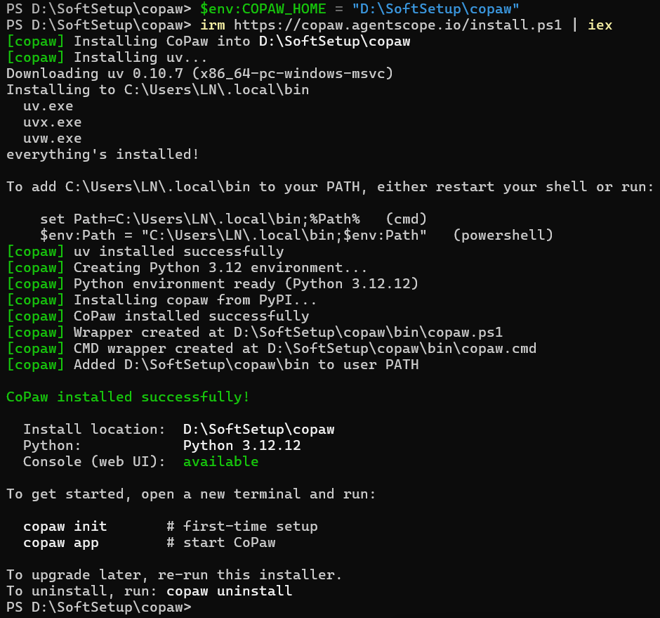 这条命令会临时配置环境变量,安装脚本会根据此变量将 Copaw 部署到指定目录。