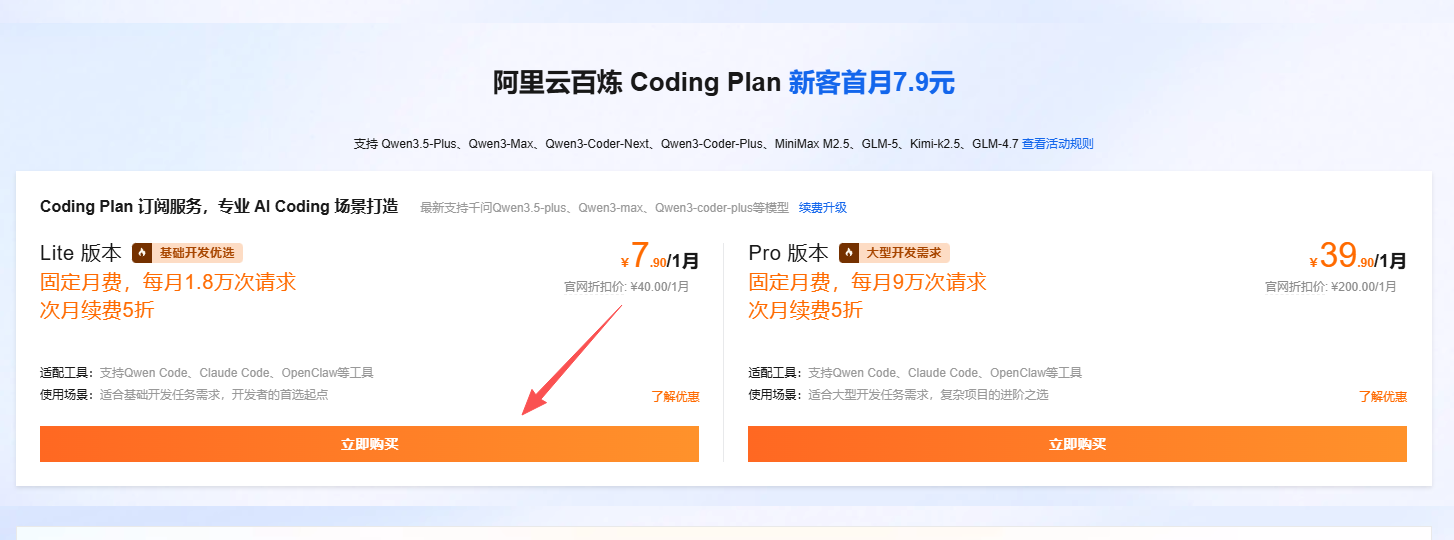 这里推荐阿里云百炼Coding Plan,按次消耗,新用户首月 7.9 元起,18000 次请求,轻度使用足够;