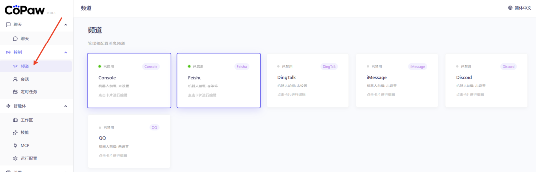 以飞书为例,在Copaw的配置页面里找到“频道”页,进入。