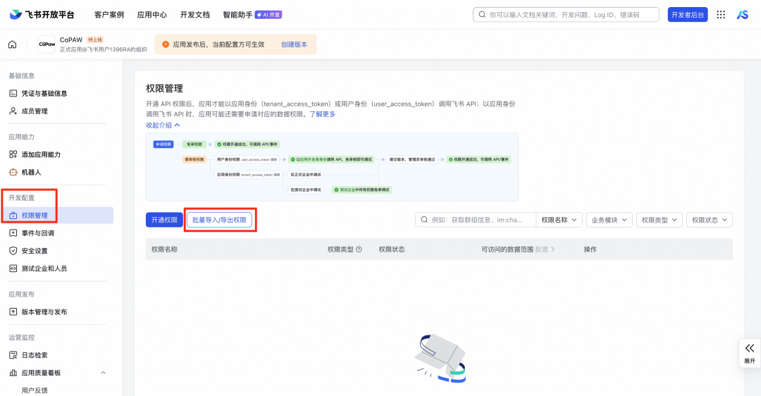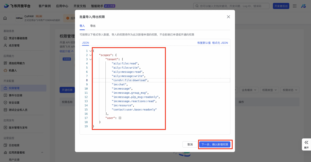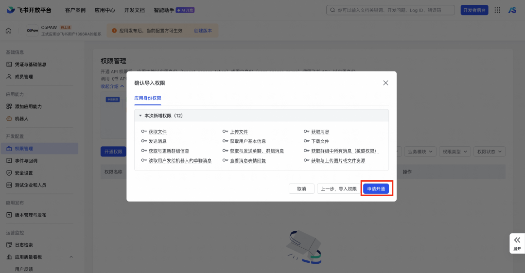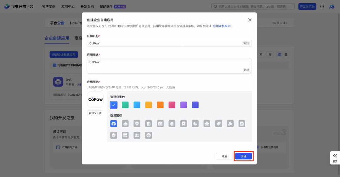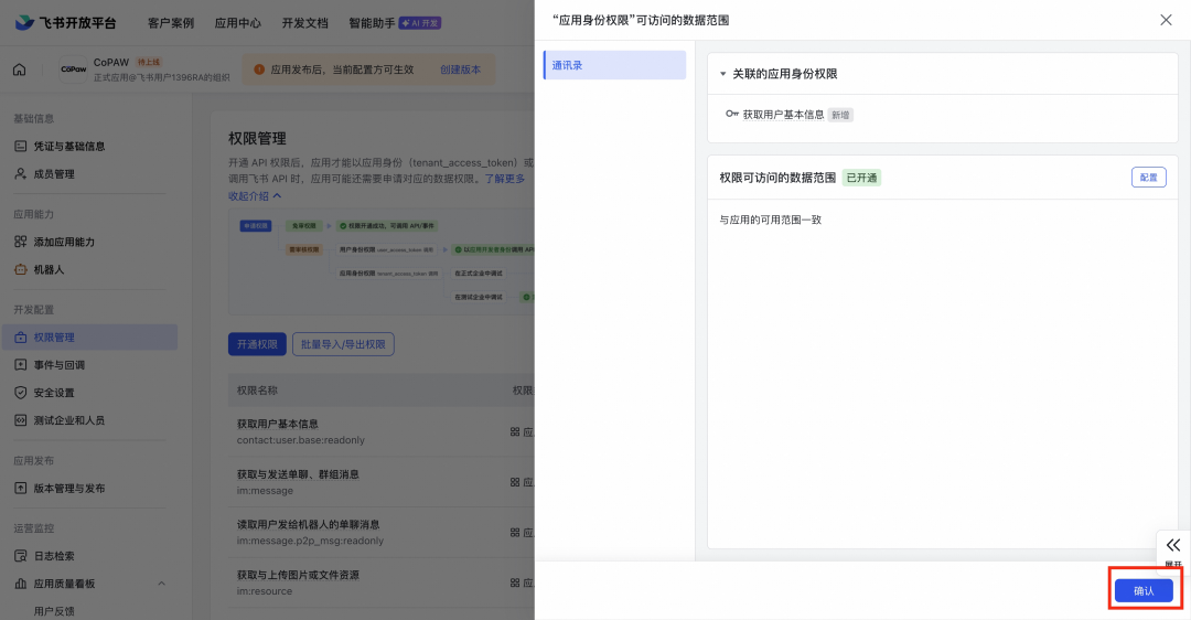 在「凭证与基础信息」模块中获取 App ID 和 App Secret(这两个参数就是上面 Copaw 中需要配置的)