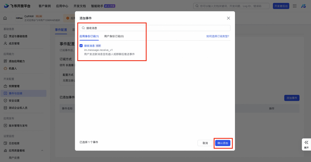 点击「添加事件」,搜索并订阅「接收消息 v2.0」事件