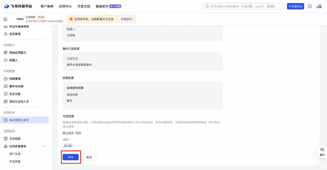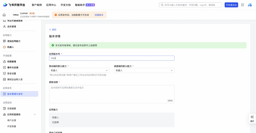 进入「应用发布」→「版本管理与发布」→ 点击「创建版本」,填写基础信息