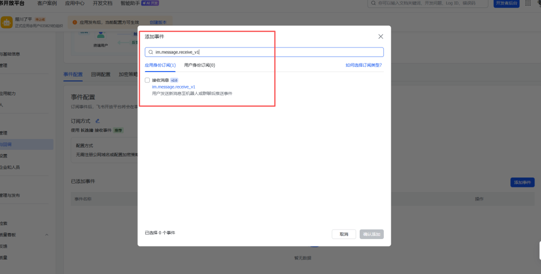 事件配置按“长连接”设置,“龙虾”会给出需要添加的项,直接复制到飞书后台。