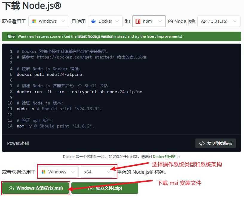 下载对应安装包(例如:node-v24.13.0-x64.msi),双击按向导完成安装。