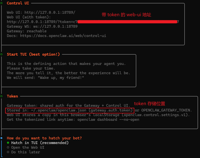 注意:包含 token 的 WebUI 地址请务必保存,首次访问需使用该地址完成初始化。