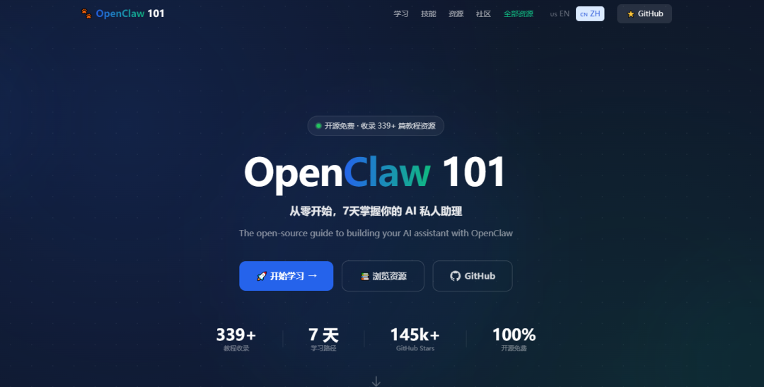 基于这些观察,开发者孟健在 2026 年 2 月用 7 天时间快速构建了 openclaw101.dev,试图通过系统化的学习路径降低入门门槛。